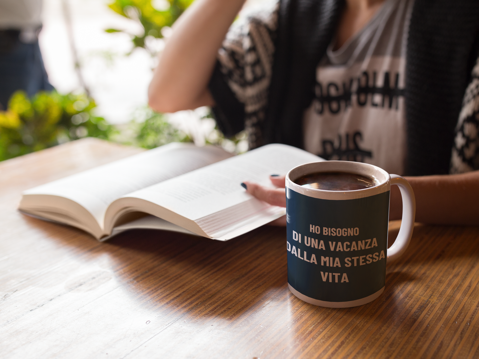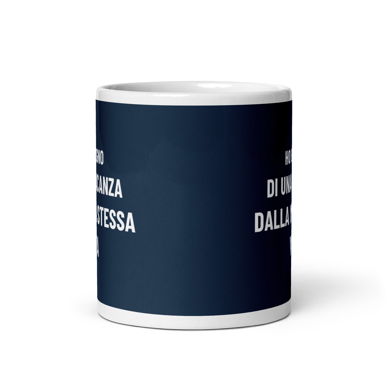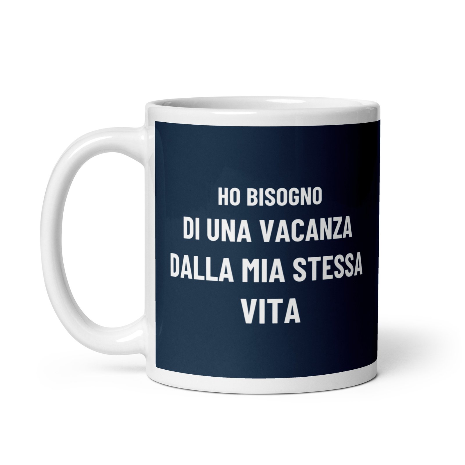 Con la scritta “Ho bisogno di una vacanza dalla mia stessa vita”, questa tazza esprime un desiderio universale: una pausa, un reset, un biglietto di sola andata per un’isola deserta dove l’unico obbligo è ammirare il tramonto.